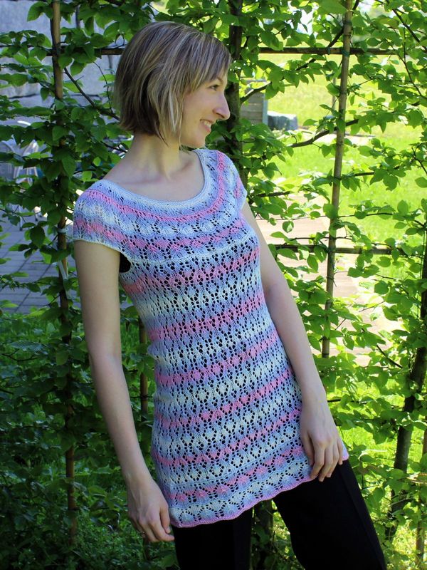 Csupa csipke és hűvös bambuszfonal: tökéletes kombináció nyárra. A tunikát lentről felfelé, egyben kötjük, varrás nélküli darab. A leírás minden részletre kiterjedő, a csipkefogyasztásokat végig kirajzoltam, a rajzokhoz szöveges leírást is mellékeltem.