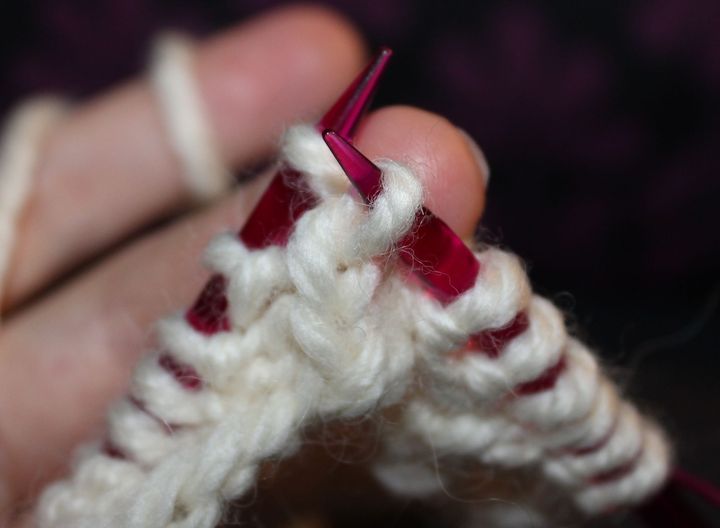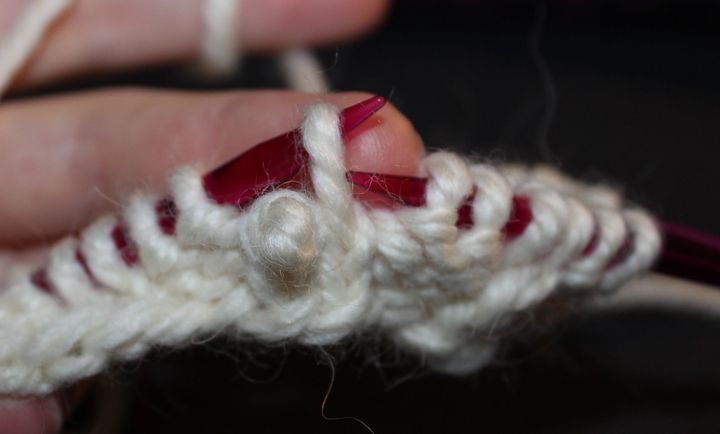 ... and pull the right needle out. The first stitch stayed on the left needle, the other stitch has been dropped. |