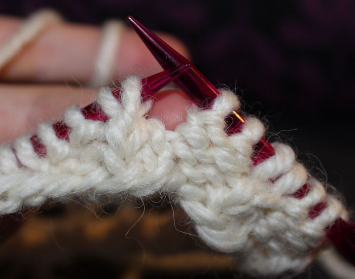 We would like to do a 1/1 RC. With a cable needle, you would work like this: slip one stitch to cable needle and hold to back, knit 1, then knit 1 from the cable needle. Let's see how to do this without a cable needle. |
