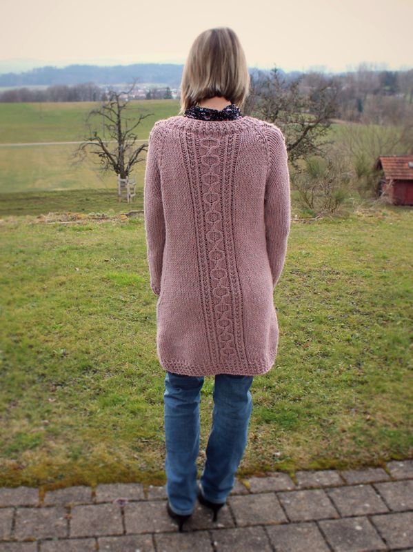 A kabát varrás nélküli minta, fentről lefelé kötjük, a vállrészt és az elejét-hátát egyenesen, az ujjakat körben.