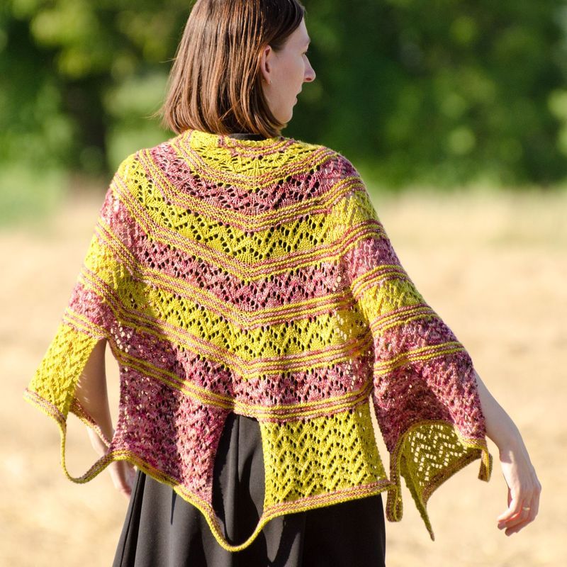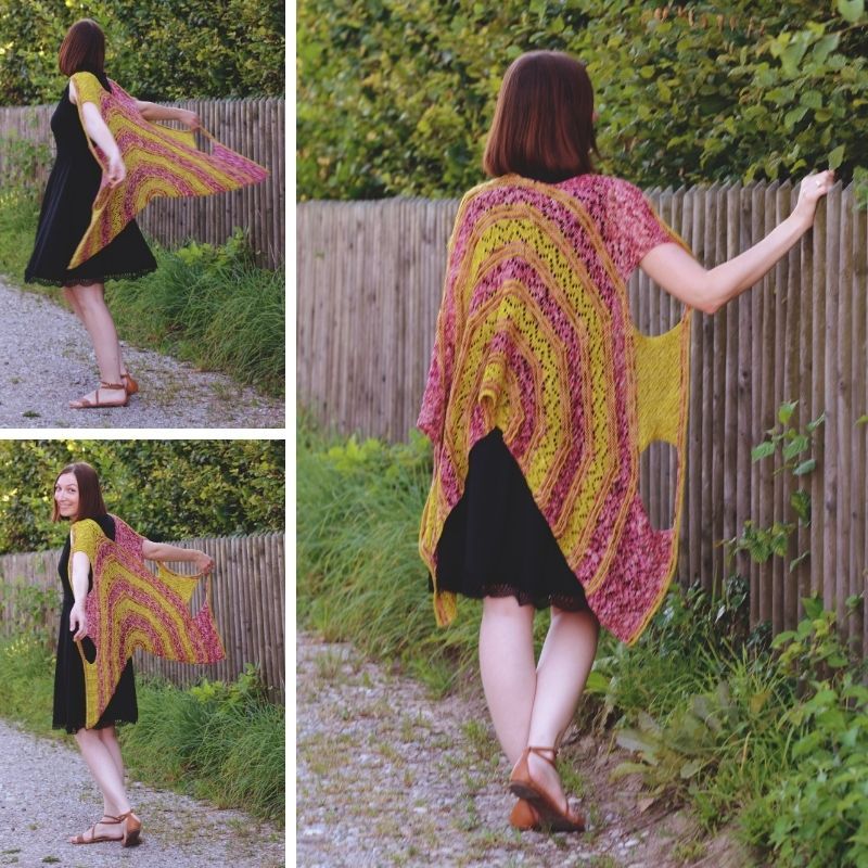 Érdekes kötni és változatos viselni! A Carousel kendő többféleképpen is hordható. Két motring zoknifonalból készül. A mintát úgy terveztem, hogy mindkét motringot szinte teljes egészében fel lehessen használni. Soha nem kell mindkét színnel ugyanabban a sorban kötni.